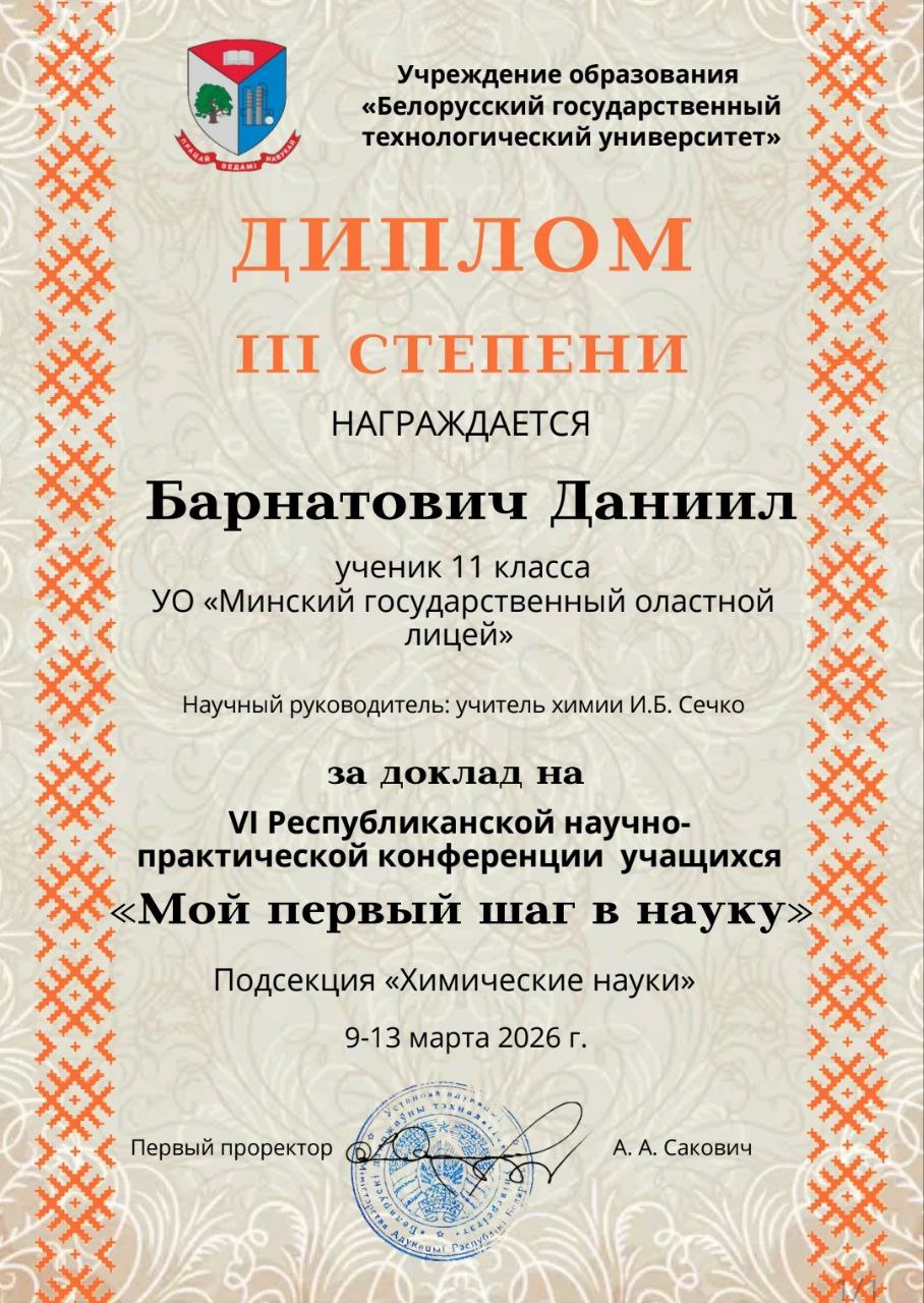 Учащийся УО "Минский государственный областной лицей" Барнатович Даниил одержал победу, диплом III степени, в VI Республиканской научно-практической конференции учащихся «Мой первый шаг в науку», которая прошла в Белорусском государственном технологическом университете.
