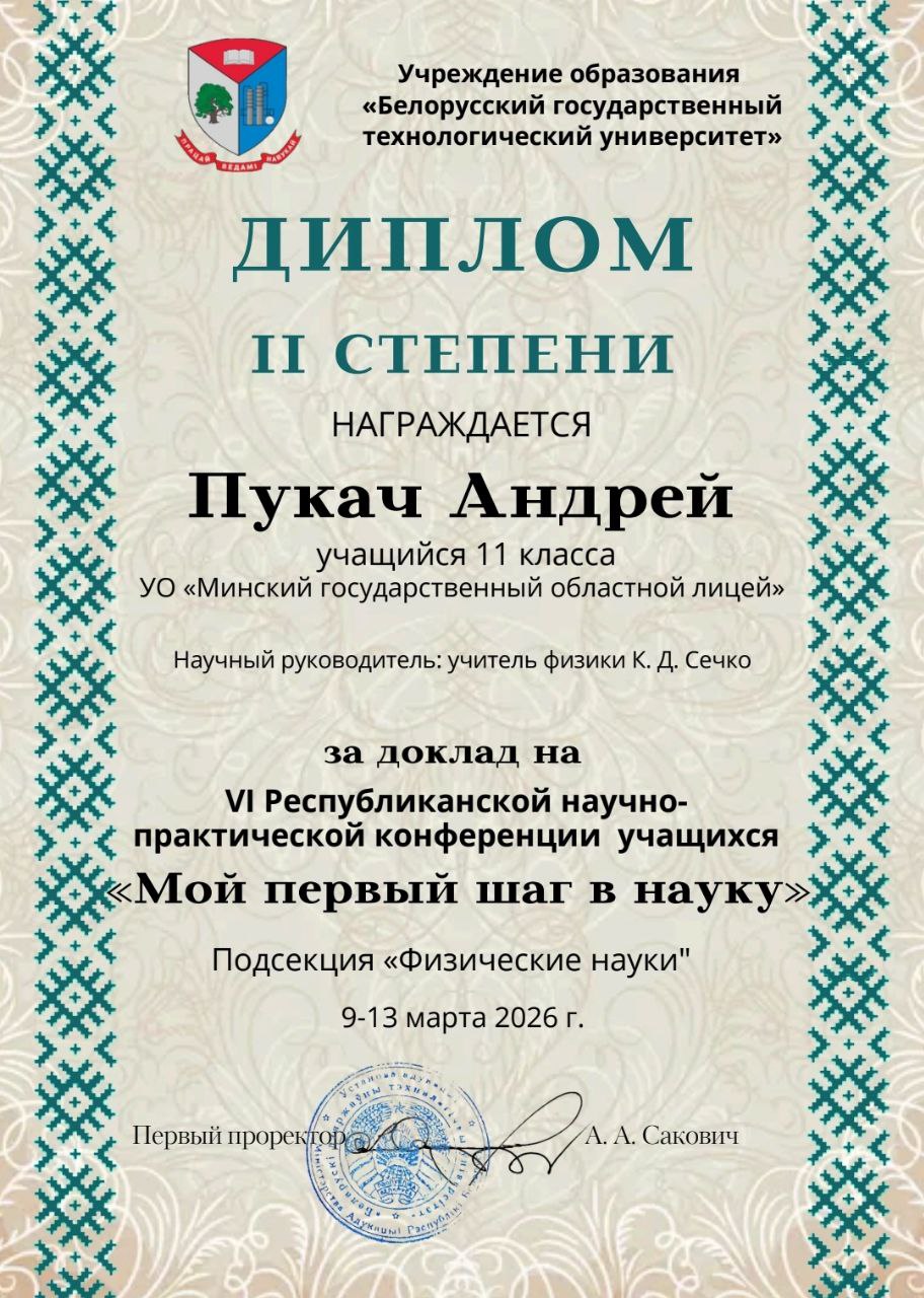 Учащийся УО "Минский государственный областной лицей" Андрей Пукач одержал победу, диплом II степени, в VI Республиканской научно-практической конференции учащихся «Мой первый шаг в науку», которая прошла в Белорусском государственном технологическом университете.