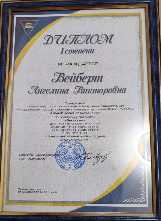 Поздравляем учащуюся УО "Минский государственный областной лицей" Вейберт Ангелину с победой в многопрофильной университетской олимпиаде Гродненского государственного университета имени Янки Купалы.